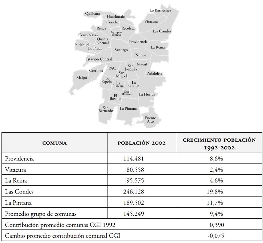 Sin embargo, hay bastante heterogeneidad en el grupo de comunas. Por una parte, diversos municipios relativamente centrales y cercanos entre sí, como Santiago, San Joaquín, Lo Espejo, Pedro Aguirre Cerda, San Miguel y Macul, redujeron su población entre un 5% y 15%, aproximadamente. Todas ellas se encuentran localizadas al sur de la comuna de Santiago, limítrofes entre sí y en relación con la avenida circunvalación Américo Vespucio. Otras comunas que tuvieron pérdidas de población son Conchalí, Quinta Normal, Recoleta y Estación Central, que redujeron su población entre 13% y 10%. Todas ellas están localizadas al norte y poniente de la comuna de Santiago. Por otra parte, otras más periféricas, como Quilicura, Puente Alto, Maipú, Pudahuel y San Bernardo, experimentaron aumentos poblacionales extraordinarios, de 208%, 95%, 80%, 42% y 30%, respectivamente, sumando un total cercano a los 620.000 habitantes. Comunas más pequeñas, como Lo Barnechea y Huechuraba también crecieron considerablemente, un 55% y 20%, respectivamente. Otra comuna cuya población creció por sobre el promedio metropolitano, en torno al 20%, fue Peñalolén.