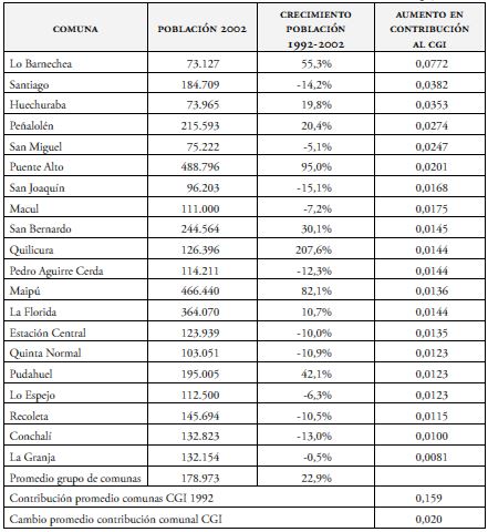 El segundo grupo consiste en las 20 comunas cuya contribución al cgi creció más que el aumento total del cgi entre 1992 y 2002 en el Gran Santiago (0,074, véase cuadro 1).17 Las comunas se ordenan de mayor a menor aumento en la contribución. Lidera el grupo Lo Barnechea, que en este período se consolidó como un suburbio de altos ingresos. En promedio, el aumento de la contribución cgi en este grupo fue de 0,020. En él se incluyen las comunas más pobladas de Santiago y del país –Puente Alto y Maipú– y, en promedio, el grupo experimentó un aumento poblacional de un 22,9%, valor bastante mayor que el promedio del Gran Santiago, de un 13,6%.