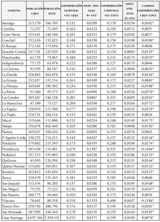 Una interpretación de esta contribución comunal es que es una medida que captura el promedio comunal de la diferencia entre la distribución de ingresos de una manzana y la distribución de la ciudad. Esta cantidad permite, en conjunto con los cambios poblacionales, evaluar cuál sería el impacto “incremental” sobre la medida de segregación del Gran Santiago de ignorarse una comuna.