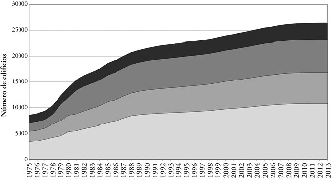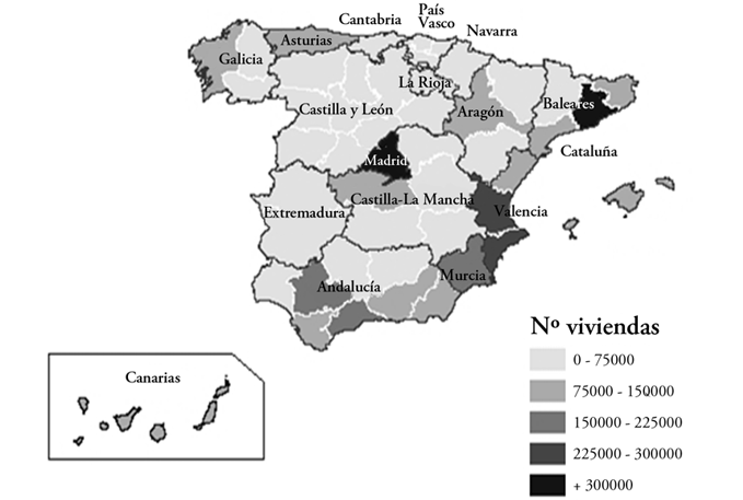 Resulta especialmente dinámica la actividad de la construcción en las provincias de Alicante y Murcia. Durante el periodo de estudio (1975-2013), la población aumentó en torno a un 215%, mientras que el número de casas lo ha hecho en un 373% (ine, 2013). La tendencia edificatoria experimentada por Alicante antes de la crisis de 2008 pronto la situó en el tercer puesto del ranking nacional tras las provincias de Madrid y Barcelona, por encima de otras de mayor entidad de población, como Valencia o Málaga. Incluso, si consideramos de forma conjunta la significación del fenómeno en la franja litoral de Alicante y Murcia, este espacio geográfico de menos de 5.000 Km2 (4.611 Km2) acoge algo más de 1,6 millones de habitantes (1.638.819 según datos del ine, 2013), y ocuparía la segunda posición nacional en incremento de la actividad constructiva, tan solo por detrás de la capital del Estado.