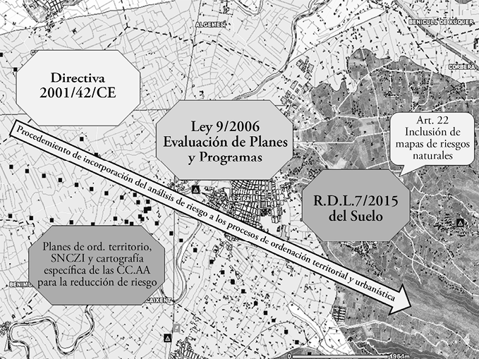 En la actualidad, la vigente Ley del Suelo estatal (2015), texto refundido del Real Decreto Legislativo (rdl) 2/2008, obliga a la elaboración de mapas de riesgo, con lo cual se desmorona esa “excusa” justificadora de la invasión de terrenos inundables. Debido a su juventud, no ha tenido aún efecto en los municipios litorales de Alicante y Murcia; pero, sobre todo, su posible influencia no ha dejado todavía constancia por el parón inmobiliario vivido desde el año 2008, que ha ralentizado, asimismo, la revisión de documentos de planeamiento urbano municipal y, con ello, la obligación de incluir mapas e informes de riesgo natural en los informes de sostenibilidad ambiental que tienen que acompañar estos nuevos documentos (figura 8).