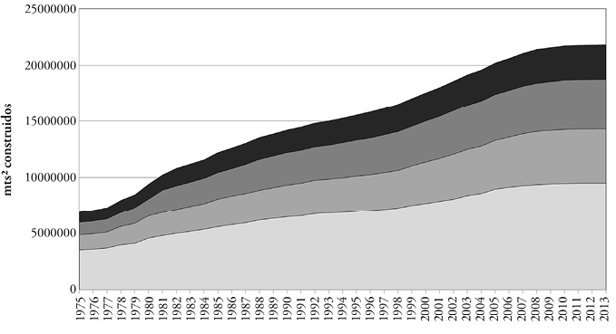 En este ámbito geográfico concreto, el crecimiento urbano normal se ha visto fuertemente impulsado por el aumento en la demanda de viviendas secundarias para vacaciones, o residenciales, por parte de turistas nacionales y, sobre todo, extranjeros (Burriel, 2008). Durante el periodo 2001 a 2011, el número de habitantes centroeuropeos y nórdicos que se instalaron en las provincias de la costa mediterránea ascendió un 481%, lo que supone un total de 477.325 nuevos habitantes, superando de forma significativa el crecimiento experimentado por la población española, 110,5% para el mismo intervalo de tiempo (Instituto Nacional de Estadística [ine], 2013). La llegada de esos nuevos residentes disparó la cifra de nuevas construcciones entre 1970 y 2013 en más de un 233,24% en cuanto a los inmuebles de carácter residencial, y en un 317% el total de ellos (Dirección General de Arquitectura, Vivienda y Suelo [dgavs], 2014). Para dar idea de la repercusión que tuvo dicho fenómeno a escala nacional, de todo lo que se construyó en España para el periodo mencionado, el 43,9% de los edificios y 40,7% del total de la superficie se llevó a cabo en el litoral mediterráneo (figura 1).