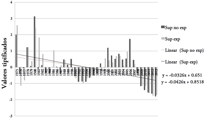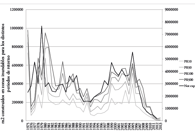 La figura 6 ilustra la tendencia seguida por la superficie construida en zona inundable con respecto al total construido. Se advierte una variabilidad que se ajusta a las coyunturas de crisis y crecimiento señalados. No obstante, la línea de tendencia de la superficie expuesta indica un descenso algo mayor que la de la superficie no expuesta. Este hecho estaría en relación con la mencionada ocupación intensiva de los espacios de riesgo en las décadas anteriores (1970 a 1990) respecto a la última fase de fuerte crecimiento inmobiliario y al efecto que han podido tener las restricciones legales de ocupación de áreas de riesgo (leyes del suelo 1998, 2008, 2015 y planes regionales de ordenación del territorio).