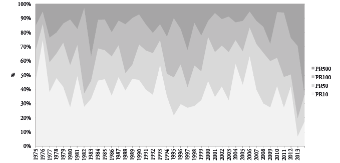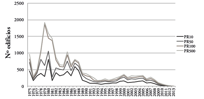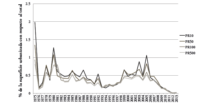 El análisis detallado de la figura 3 permite distinguir dos periodos bien diferenciados: 1975-1993 y 1994-2013. El primero viene precedido por la primera crisis del petróleo en 1973. Pese a la fuerte repercusión que tuvo este acontecimiento y que llevó, en términos globales, a un estancamiento de la economía española durante una década, sus efectos sobre la actividad inmobiliaria fueron efímeros en el ámbito espacial estudiado, fruto de las necesidades habitacionales de una población creciente, junto con la expansión de las viviendas para un sector turístico en continuo crecimiento. De esta manera, a partir de 1977 el crecimiento urbano en espacio inundable y no inundable fue intenso. Las causas principales de esta nueva dinámica deberían buscarse en los cambios que introdujo la mencionada crisis en el modelo económico español, con la paulatina terciarización de la economía regional y la progresiva importancia en el pib estatal del sector servicios (Prados & Sanz, 1996). Este proceso tuvo especial influencia en las regiones y municipios turísticos como los del área de estudio, ya que ejerció, junto a la entrada de España en la Unión Europea en 1986, un efecto llamada de la población atraída por el impulso de esas actividades (Harrison, 2006), principalmente el turismo, lo que a la postre supuso un aumento en la construcción de edificaciones para satisfacer la llegada de trabajadores y visitantes. Entre 1975 y 1980 se construyó un total de 35.618 nuevos inmuebles en el área de estudio, de los cuales 6.361 (17,8%) fueron levantados en zona inundable (figura 4a), lo que supone una tasa media de ocupación del espacio inundable (la velocidad a la que se va saturando la superficie inundable) del 0,61% anual en todas las zonas expuestas, y un máximo de 1,9% para el pr10 (figura 4b), en lo que fue el momento de ocupación del espacio inundable de mayor intensidad de toda la serie analizada.