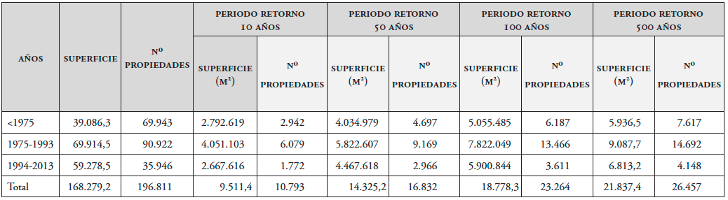 En definitiva, este periodo ha supuesto un incremento de 6.813.211 m2 construidos en zona inundable, que, añadidos a lo que ya había acumulado, dan como resultado una cifra global de 21.837.416 m2. Esto ha provocado una saturación del espacio inundable que ha motivado diferencias urbanísticas, puesto que durante el boom urbanístico reciente el número de edificaciones construidas en zona inundable fue mucho menor (4.148 entre 1994 y 2013, frente a los 14.692 del periodo comprendido entre 1975 y 1993), lo que indica una mutación del modelo urbanístico hacia el poblamiento en forma de grandes dominios asociados a una única edificación (tabla 2).