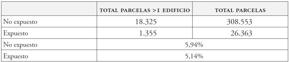 A pesar de las bondades de las fuentes manejadas, se tuvo que hacer frente a una serie de limitaciones asociadas a la propia naturaleza y características de las mismas. En lo referente a los datos catastrales vinculados a parcelas, se detectó que, en algunos casos, una misma parcela catastral puede contener más de un edificio construido en distintos años. En esos casos se tomó el año de la edificación más antigua. De esta manera, asumimos que no hay propiedades antiguas que hayan sido demolidas o sustituidas por unas más nuevas, lo cual nos podría llevar a una infraestimación del número de parcelas en los primeros años de la serie. Para el caso de las edificaciones del área de estudio donde se evidenció dicho error, se calculó su valor final tanto para las edificaciones expuestas como las no expuestas, tal y como se resume en la tabla 1.