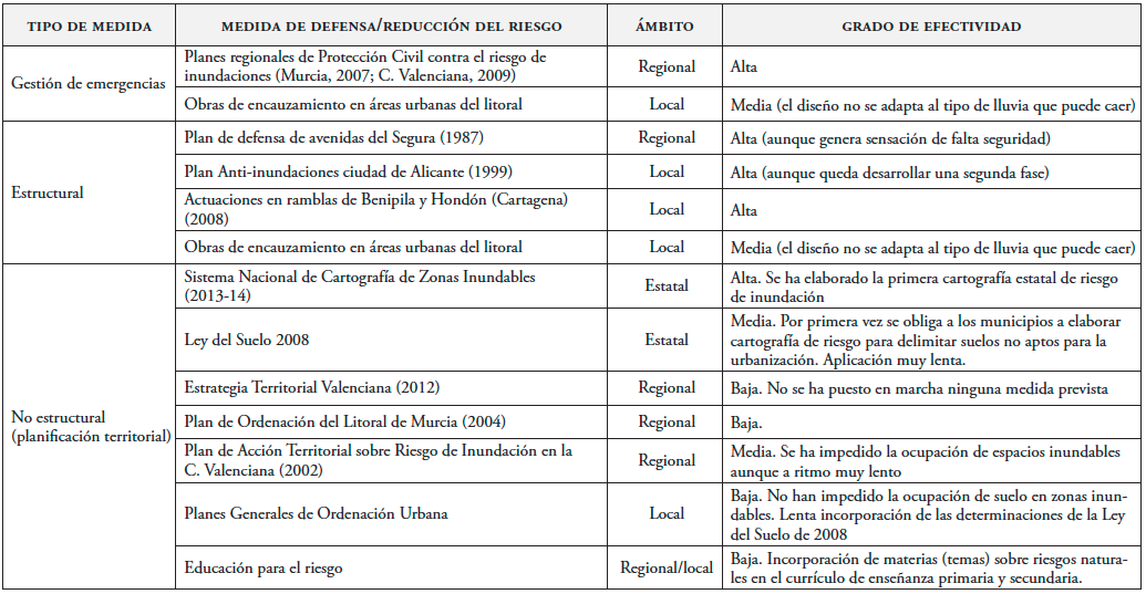 El aumento de la exposición al peligro de inundaciones que se ha experimentado en la franja litoral de Alicante y Murcia en las cuatro últimas décadas ha motivado la puesta en marcha de medidas de reducción del riesgo para aminorar sus efectos. Básicamente, se han desarrollado medidas estructurales y de gestión de la emergencia, que han conseguido reducir, de modo significativo, las víctimas. Por el contrario, como ya se ha señalado, las pérdidas económicas originadas por las inundaciones no han dejado de aumentar en los últimos años, lo que manifiesta una efectividad muy baja tanto de las medidas estructurales realizadas, como de las no estructurales, que apenas se han puesto en marcha o aplicado. Se da el hecho significativo de que en episodios de lluvia intensa de poca cuantía ocurridos en los últimos años en la zona de estudio, se producen inundaciones con efectos económicos elevados.