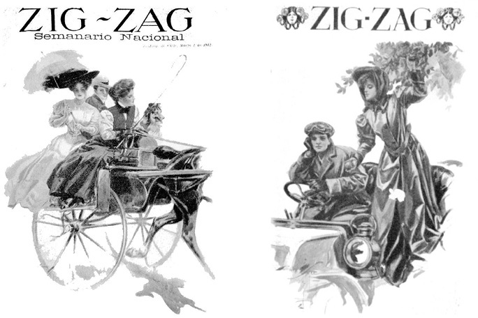 La misma revista Zig-Zag, mediante dos portadas publicadas en menos de un año (figuras 1 y 2), da testimonio de la vigencia que aún mantenían los coches particulares, al tiempo que su comparación sugiere las profundas diferencias sociales y culturales entre quienes usan la tracción animal y los que utilizan los vehículos a motor para pasear. Mientras una joven pareja vestida de fiesta y su perro de raza son conducidos por una distinguida auriga en un coche de dos ruedas, la otra pareja viste trajes especiales para resistir el polvo y el viento que conlleva una excursión en automóvil. Mientras la mujer del coche, perteneciente a la tradición del paseo en sociedad, mantiene una delicada quietud alerta a los movimientos de su entorno, la mujer motorizada, en un acto inédito de audacia y libertad, usa la altura que le proporciona el asiento de su automóvil para cosechar frutas de un árbol, que luego ofrece a su pareja, quien observa tranquilo el paisaje circundante.