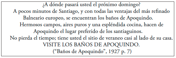 Como lo dijimos al comienzo de estas líneas, hallamos buenos panoramas, música, baños termales (de tina y natación), parque, cantina a precios corrientes y, un poquito más abajo, la quinta Santa Nicolasa, donde la “baya” encuentra siempre espíritus que saben justipreciarla. (“Nuestros domingos por los alrededores de Santiago”, 1925, pp. 5-7)