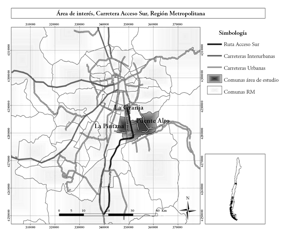 La otra, como cientista y trabajadora social, aborda el tema mediante un enfoque metodológico cualitativo, exploratorio y descriptivo en el sentido de Orlikowski y Baroudi (1991), cuyo propósito es entender cómo los miembros de un grupo social, a través de su participación en procesos sociales, establecen sus realidades particulares y las dotan de significado (Reyes & Hernández, 2008, p. 8). Usa el estudio de casos como estrategia microsocial, que permite profundizar en las características del proceso de instalación y puesta en marcha de la Autopista Acceso Sur, y sus implicancias en la movilidad y vida cotidiana de los habitantes de los barrios aledaños, ubicados en las comunas de La Granja, La Pintana y Puente Alto de la Región Metropolitana (rm) de Santiago.