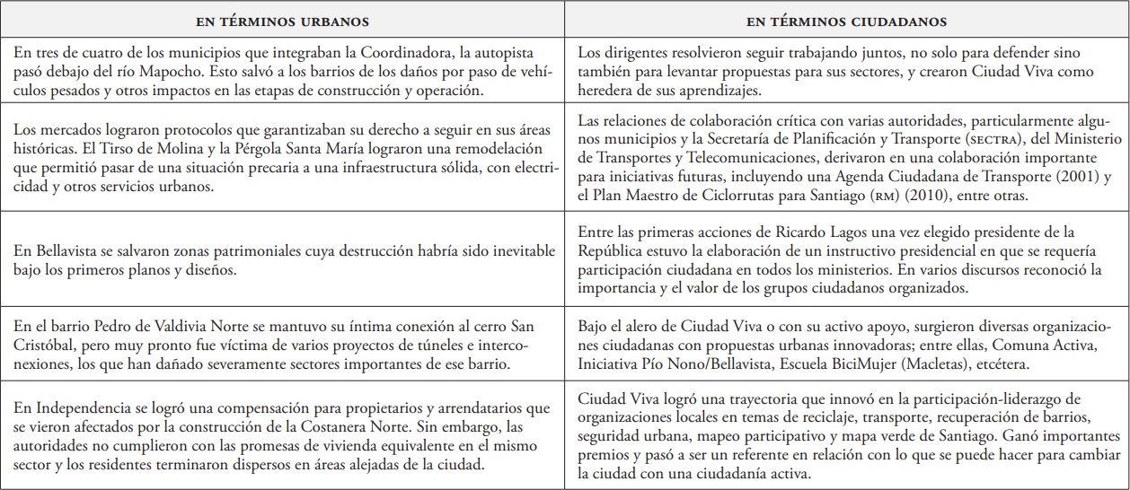 No queremos darles una lectura excesivamente exitista a estos cambios, ya que en los años siguientes (1997-2007) ni la Coordinadora ni Ciudad Viva tuvieron la capacidad de expandir sus iniciativas más allá del barrio La Chimba. Aunque algunos dirigentes individuales tuvieron un efecto positivo en otros temas, como los planes reguladores de Recoleta y de Providencia, la colectividad no logró su meta de apoyar a otros grupos enfrentados a autopistas. Esta falla, que revela además la resistencia de los políticos y las instituciones a innovaciones favorables al resguardo de los derechos ciudadanos, costó cara a las comunidades que casi simultáneamente enfrentaron otro conflicto por una autopista, el Acceso Sur, también en Santiago, pero esta vez en el extremo sur de la ciudad, donde se concentran sectores de bajos recursos.