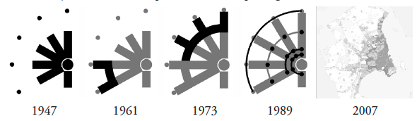 Otro de los rasgos significativos característico del plan ha sido su evolución y adaptación a las necesidades de crecimiento. El plan Dedos de 1947 tomó como base el plan de tráfico de 1926, que establecía el desarrollo urbano a lo largo de líneas férreas que partían en forma radial desde el centro de la ciudad, y se organizaba en torno a las estaciones ferroviarias. En 1961, el crecimiento que estableció el plan de 1947 fue ampliamente superado, debido a la industrialización. Esto dio lugar a asentamientos fuera de los “dedos” planeados, elevado tráfico y presión sobre el área central, debido a la estructura monocéntrica. Tal situación llevó a que el plan de 1961 promoviera el crecimiento urbano en los dedos ubicados al oeste y al sudoeste del centro de la ciudad. Posteriormente, el Plan Regional de 1973 extendió los dedos ubicados al norte del centro de la ciudad, y la vinculación transversal a todos los dedos. Debido al estancamiento del crecimiento urbano, no se consideró necesario elaborar un nuevo plan hasta el Plan Regional de 1989, que se centró en los puntos nodales de tráfico y en la continuación del desarrollo urbano en torno a las estaciones ferroviarias; a la vez, se generó otra vinculación entre los dedos, paralela a la anterior y más alejada del centro de la ciudad. Finalmente, el Plan Regional de 2001 planteó la aparición del sexto dedo en la isla de Amager. Esta isla, en los años noventa, había quedado integrada en la estructura urbana con la implantación de un metro y la conexión fija con el aeropuerto y con Suecia a través de un puente. Hoy los dedos llegan a los pueblos de la provincia, como resultado de la extensión de la urbanización metropolitana y la red eléctrica de ferrocarriles (figura 11) (Ministry of the Environment, Denmark, 2007).