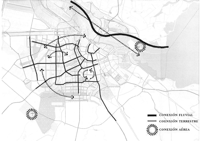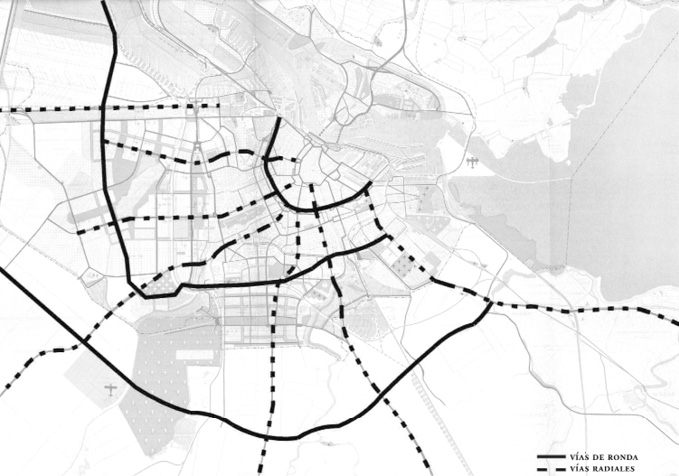 En esta línea, el plan propuso también tres vías de ronda norte-sur: una urbana, una interurbana y una periférica. A este sistema se le superpone otro sistema de conexión viaria con la ciudad existente, a través de vías radiales este-oeste que vinculan el casco antiguo con el espacio rural (figura 4).
