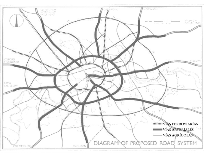 A fin de aliviar la congestión del tráfico, en el plan del Condado de Londres se estableció una jerarquía de carreteras, sistema que definía los cortes físicos y funcionales de la estructura de Londres; el límite de la zona central, el límite de la densidad de los núcleos interiores y el límite entre los suburbios y el espacio rural. El diagrama viario se resolvió con 21 vías radiales (de las cuales 9 tenían consideración arterial) y 3 anillos: el anillo A, interior y que comunicaba todas las estaciones de ferrocarril que parten radialmente de Londres; el anillo B, que articulaba todo el área del Condado y de él partían todas la vías arteriales de carácter radial; y el anillo C, que articulaba el territorio agrícola externo al Condado (figura 8).