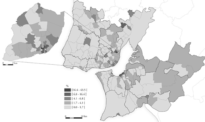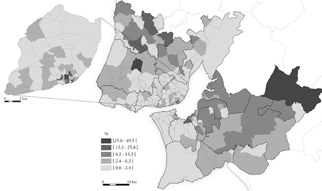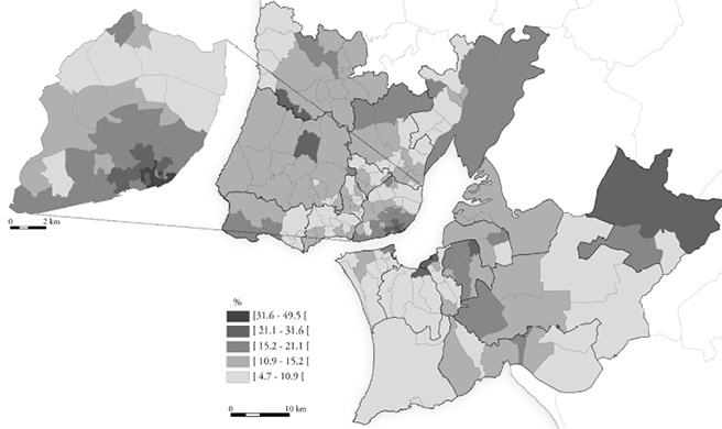 Também é equívoco supor que os espaços de arruinamento se confinam ao centro metropolitano (figuras 3 e 4). Os dados do censo da habitação de 2011 revelam que só 23% dos edifícios “muito degradados” da área metropolitana estavam na cidade de Lisboa, apesar de aqui se situarem 46% dos imóveis construídos antes de 1919 e 80% dos imóveis construídos até 1945. Várias freguesias3 da periferia possuíam edifícios “muito degradados” em proporções comparáveis às do centro metropolitano; por outro lado, embora as concentrações mais elevadas de imóveis nestas condições se registassem no núcleo histórico de Lisboa, o cenário não era aí homogéneo: havia sectores onde essa presença atingia proporções máximas – a Baixa Pombalina, especialmente a parte mais a norte, a Mouraria e Graça, e a parte baixa de Alfama – mas também outras áreas onde a sua frequência era pouco relevante – por exemplo, na Lapa, Chiado, São Mamede (eixo Príncipe Real-Rato-Jardim das Amoreiras) ou em redor da Avenida da Liberdade.