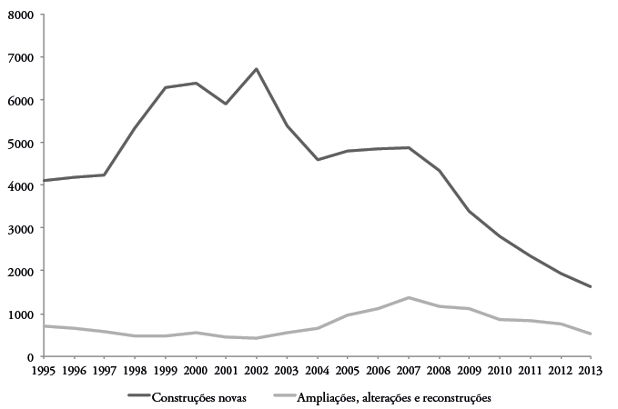 A eficácia dessas medidas foi limitada se atendermos aos objetivos que técnica e politicamente eram invocados: não contiveram a dispersão do edificado nas periferias, e não inverteram a perda de população do centro metropolitano. Contudo, criaram condições atrativas de reinvestimento em espaços devolutos e arruinados, que beneficiaram sobretudo as localizações centrais. É um facto que o investimento continuou a privilegiar desproporcionadamente as construções novas em detrimento de obras sobre edifícios já existentes: entre 1995 e 2013, reabilitaram-se 3,7 milhões de m2 na Região de Lisboa (entre ampliações, alterações e reconstruções de imóveis), enquanto foram produzidos 59,5 milhões de m2 em edifícios novos. Porém, a reabilitação urbana ganhou relevância com a viragem do século. Entre 2002 e 2007, as obras em edifícios existentes aumentaram a um ritmo superior ao das construções novas (gráfico 1). A partir de 2008, com a crise financeira global e depois a crise da dívida soberana na zona euro, todo o sector imobiliário se retraiu, mas a reabilitação urbana não caiu tão a pique como as construções novas – em parte graças ao regime extraordinário de que beneficiava –, de modo que a quota das operações de remodelação, ampliação e reconstrução no total das obras concluídas passou de 6% em 2002 para quase 25% em 2013.