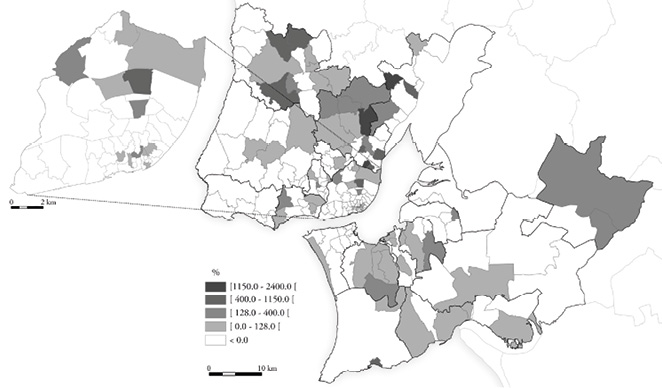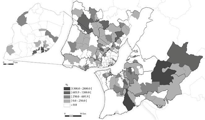 Essa regeneração do edificado não impediu que os arruinamentos prosseguissem. Por vezes nos mesmos bairros, e até nas mesmas ruas, em que certos prédios foram reabilitados, outros foram abandonados e entraram em deterioração. Num cenário geral de diminuição dos imóveis “muito degradados”, que incluiu o centro metropolitano, especialmente as localizações de prestígio no seu núcleo histórico, registaram-se pontualmente agravamentos dessas situações, como no Bairro Alto, Santa Justa-Socorro, parte de Alfama e na Graça (figura 5). É de notar que o Bairro Alto fora das primeiras áreas do centro histórico de Lisboa a conhecer processos de gentrificação nos anos 90 (Mendes, 2008). Tal situação corrobora a ideia de uma mutabilidade mais rápida das procuras e de uma hipermobilidade do capital que tem que ver com a turbulência da aceleração e se traduz numa instabilidade acrescida na relação com o ambiente construído. Alguns focos de degradação surgiram entretanto nas expansões modernas da cidade de Lisboa. Mas foi sobretudo para as periferias da área metropolitana que o arruinamento migrou, facto que resulta também visível quando se atenta no aumento dos imóveis para demolição (figura 6). Importante ressaltar ainda é que a esta periferização do arruinamento se ligou um avanço mais rápido da deterioração sobre imóveis modernos, nomeadamente blocos de apartamentos já da segunda metade do século xx, o que vem em favor da ideia de um obsolescimento cada vez mais rápido do edificado.