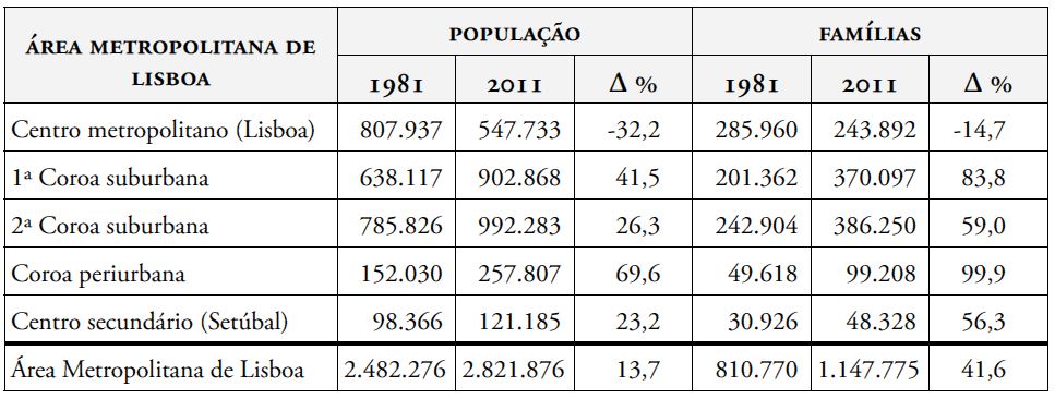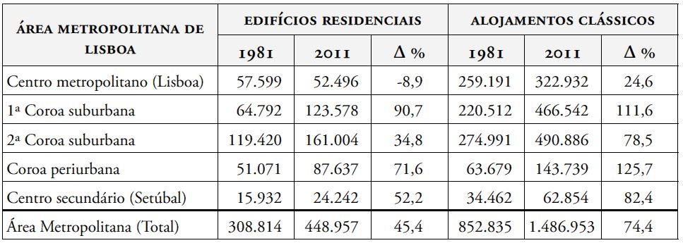 Um corolário do surto modernizante acima descrito foi o encolhimento do centro metropolitano. De 1981 para 2011, Lisboa-cidade perdeu praticamente um terço da população, desapareceram 9% dos edifícios de habitação em resultado de demolições e conversões para outros usos, e o número de alojamentos sem ocupante (exclui residências secundárias) aumentou 208%, subindo para mais de 50 mil. Em 2011, 790 prédios de habitação aguardavam demolição no centro metropolitano e 3% dos edifícios (cerca de mil e quinhentos) foram classificados no censo desse ano como “muito degradados”.2 Além destas situações de deterioração extrema, quase 12 mil imóveis necessitavam de intervenções urgentes segundo avaliações do município de Lisboa, estimando-se que fossem necessários 8.000 milhões de euros para a sua reabilitação (Simões, 2011).