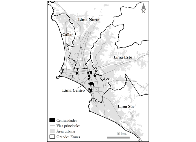 Como una primera aproximación a los centros urbanos de Lima, el estudio de Chion (2002) fue sugerente, pues identifica concentraciones a partir de actividades predominantes a finales del siglo xx, como las financieras y comerciales, las industriales, y otras como las de esparcimiento. Sobre esa base destaca nodos urbanos, entre ellos el llamado distrito financiero de San Isidro o la zona comercial-industrial de Gamarra. Chion no encuentra centros de carácter metropolitano fuera del área central de la ciudad, aunque destaca la importancia de centros distritales en actividades comerciales o industriales en zonas de expansión, como Lima Norte, Lima Este o Lima Sur.
