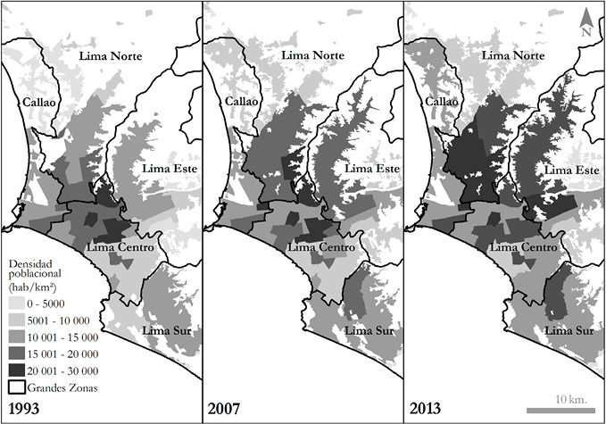 En efecto, a pesar de que los edificios de mayor altura se concentran en el área central de la ciudad, esta zona –contra lo que se puede suponer– ha dejado de ser la más densa en términos residenciales. Según indican los cambios ocurridos entre los censos de 1993 y 2007, así como las proyecciones actuales (figura 2), las áreas que concentran mayor población residencial se hallan sobre todo en Lima Norte y, luego, en Lima Este y Lima Centro. Esto cambia completamente el panorama con respecto a lo que ocurría en Lima hace veinte años, cuando las zonas de expansión tenían una densidad residencial muy inferior a la zona central de la metrópoli.