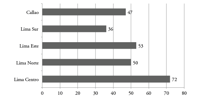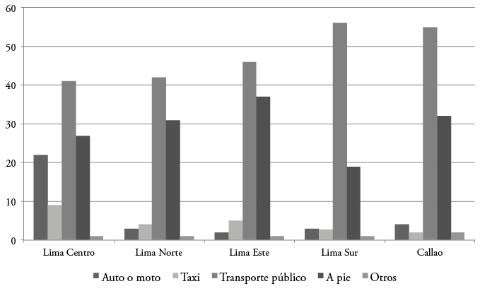 Es llamativa la concentración del uso del coche privado en la zona central de la ciudad, pese a que sus habitantes son los que menos viajes interzonales realizan. En Lima Centro, el uso de motocicletas o automóviles propios asciende al 21%, mientras que en el resto de la metrópoli este modo de desplazamiento representa el 10% o menos. Los viajes peatonales por motivos laborales son minoritarios, aunque es significativo que el 20% de adultos entrevistados en Lima Norte sí acuda a pie a su lugar de trabajo. En suma, partiendo de los espacios residenciales, los habitantes del área central de la ciudad son los que tienen menor necesidad de viajar fuera de la gran zona en la que residen por motivos laborales, mientras las posibilidades de empleo concentradas en las grandes zonas de expansión de la metrópoli solo tienen capacidad de cubrir la mitad de las necesidades laborales de su propia población residente.