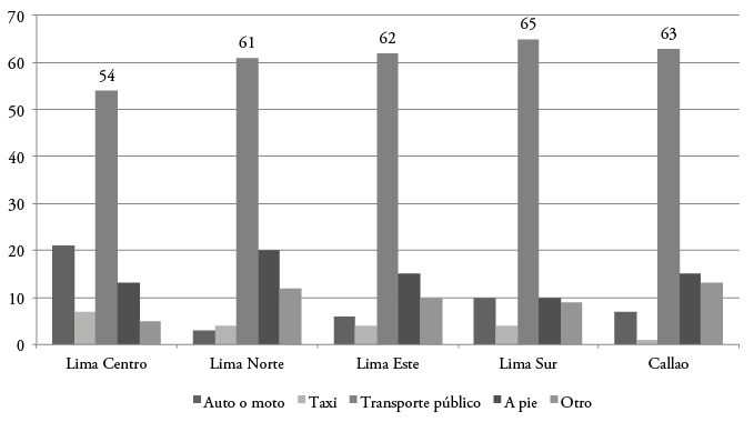 Un efecto de lo anterior será la necesidad de medios motorizados para resolver largos viajes al trabajo. Como se observa en la figura 4, el principal modo de desplazamiento utilizado en cualquiera de las grandes zonas de Lima es el transporte público, que representa largamente más de la mitad de las opciones, aunque siempre más significativo en las áreas de expansión.