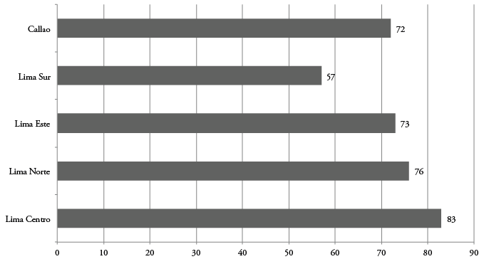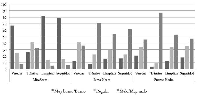 De igual tendencia es la percepción de la seguridad, donde el 78% la califica de buena o muy buena en Miraflores, cuando el 61% en Independencia y el 47% en Puente Piedra la perciben mala o muy mala. El centro urbano localizado en Miraflores es un imán de escala metropolitana cuyo espacio público es favorablemente percibido en términos generales, situación que actualmente no existe en las otras dos concentraciones, donde es poco usual encontrar a residentes de otras grandes zonas de la metrópoli y donde las percepciones de las veredas, el tránsito, la limpieza y la seguridad son de muy bajos niveles.