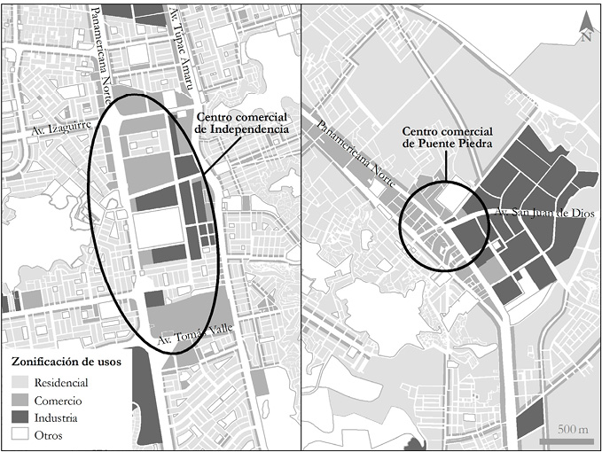En suma, nos encontramos ante dos centros que tienen como característica común el contar con varias manzanas destinadas al uso industrial, pero donde la actividad predominante es el comercio. La diferencia entre ambos es que mientras en Puente Piedra los principales actores son las asociaciones de numerosos pequeños comerciantes, en Independencia los grandes centros comerciales ahí localizados tienen un rol significativo.