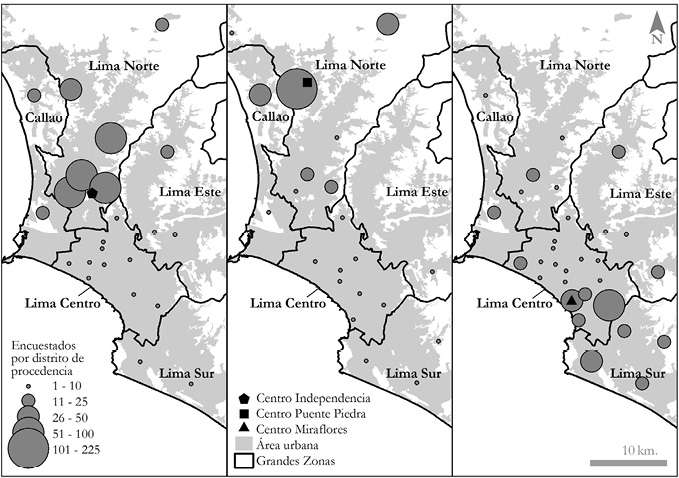 En primer lugar, al observar la procedencia de los entrevistados, se hace evidente que, en el caso de Miraflores, el poder de convocatoria de la centralidad trasciende Lima centro, pues cerca del 50% de sus usuarios proviene de otras zonas de la ciudad, inclusive algunos de otras regiones del país o del extranjero. Los centros de Lima Norte son importantes dentro de su gran zona, pero no lo son para el conjunto de la ciudad.