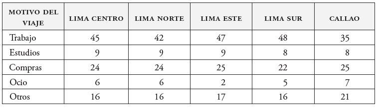 Estudios como los de Gonzales y Del Pozo (2012) ya advirtieron que, utilizando como indicador la densidad del empleo, la estructura urbana de Lima mantenía las principales grandes concentraciones dentro de la zona central de la metrópoli. Los resultados de la encuesta de movilidad que aplicáramos encuentran una tendencia similar, cuando resulta que salvo los limeños de Lima Centro, por lo menos la mitad de los adultos que habitan en áreas de expansión necesitan viajar por motivos laborales fuera de su macrozona de residencia. No obstante, esta tendencia debe matizarse cuando se considera los viajes motivados por actividades de consumo o abastecimiento, en cuyo caso solo una minoría de habitantes realiza compras fuera de la gran zona donde reside.