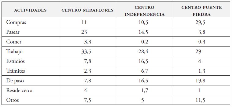 En segundo lugar, si bien a los tres centros cerca de la tercera parte de la población acude por motivos laborales (figura 8), llama la atención que en Miraflores muchos acudan por el placer de pasear, lo que indica un poder de atracción que trasciende la necesidad de viaje obligatorio, como puede ser la generada por el trabajo o el estudio; en este caso se está ante la posibilidad de realizar actividades opcionales, en la perspectiva de Gehl (2006). Por otra parte, los centros ubicados en el norte de la ciudad reúnen más del doble de población que se encuentra de paso con respecto a Miraflores; esto indicaría que estos centros no operan solamente como destino final, sino que parte de su fuerza centrípeta se explica por ser nodo de conexión importante para viajes urbanos mayores.
