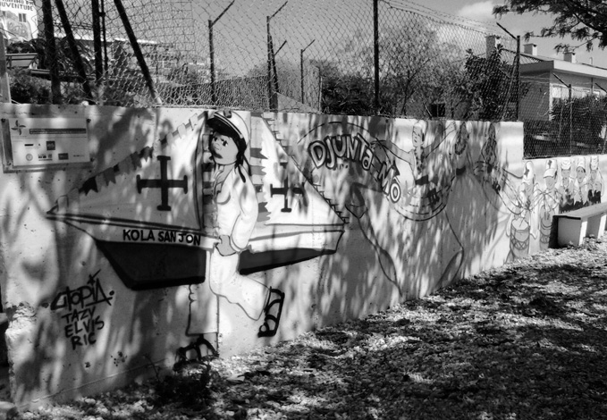 Así, dentro de un trazado laberíntico de calles estrechas, que contrasta fuertemente con el ordenamiento rígido de los barrios de viviendas sociales del entorno, las calles han sido rebautizadas con nombres que evocan lugares, expresiones o personajes propios de la historia de Cabo Verde. Esta práctica constituye un desafío radical al modelo de ordenación urbana predominante y una afirmación de la legitimidad exclusiva de los vecinos sobre este territorio (Duminy, 2014). Tanto en los letreros que adornan las calles como en el conjunto de las iniciativas de los vecinos, lideradas por la asociación Moinho da Juventude, se observa un proceso de recuperación y visibilización de palabras del criollo. Esta lengua, mayoritaria en las islas y largamente denostada como un dialecto vulgar, ha pasado a ser portadora de un sentido de orgullo y reafirmación identitaria. El barrio reivindica ahora palabras como sabura o morabeza, e incluso rescata el uso estético de la k como letra característica en la redacción escrita del criollo.