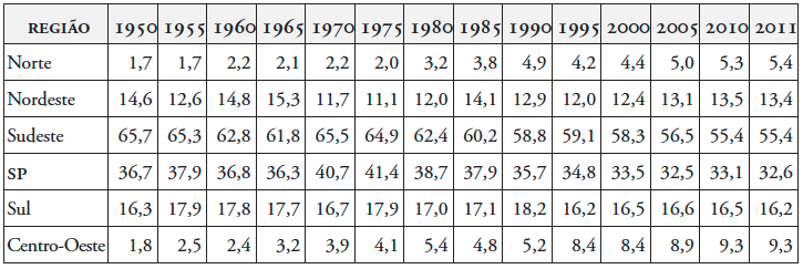 A concentração econômica e os desequilíbrios regionais5 continuam altos, com o Sudeste e Sul retendo a maior parte da riqueza do país. Mesmo com a manutenção dessas disparidades, há uma tendência à redução da parcela da renda destas regiões em direção às periféricas, conforme demonstra o quadro 1. No entanto, esse processo se deu principalmente em direção às regiões Norte e Centro-Oeste6, tendo em vista que o Nordeste brasileiro apresentava, em 2011, participação no pib do país inferior à que detinha em 1960. No entanto, conforme se pode aferir neste mesmo quadro, a partir de 1970, a perda de participação da Região Sudeste é visível, com queda de 10,1 p.p. no total. Uma perda relativa importante, porém pequena e insuficiente para reverter o histórico quadro de desequilíbrios regionais. Cabe destacar que a redução relativa de São Paulo representou cerca de 80,0% da queda da participação do Sudeste no pib brasileiro.