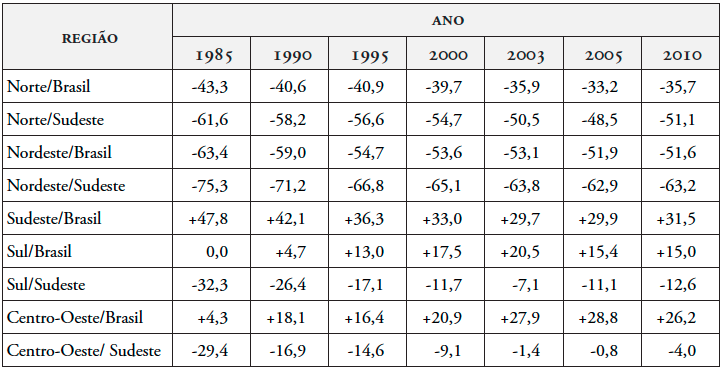 Apesar desse baixo desempenho, a desconcentração produtiva continuou, porém, a diferença entre os pib per capitas regionais continua grande, conforme se observa no quadro 2, especialmente quando se realiza uma comparação entre as regiões Norte e Nordeste, tanto em relação ao Brasil quanto à região Sudeste. Importante registrar que na primeira década do século xxi há uma pequena diminuição nessas diferenças em decorrências das políticas sociais, do crescimento real do salário mínimo, da geração de emprego e de sua maior formalização que tendem a repercutir mais favoravelmente nas áreas aonde a pobreza apresenta-se maior, que estão localizadas justamente nas duas regiões supracitadas, especialmente em suas zonas rurais. Também foi importante a recuperação do crescimento econômico, pois este elevou a renda real no país, o que repercutiu mais favoravelmente nas regiões menos desenvolvidas, sobretudo via aumento do consumo. Esse também foi influenciado pela expansão das modalidades de crédito e de financiamento que emergiram no pós-2003 expandindo mais rapidamente o comércio varejista dessas duas regiões.