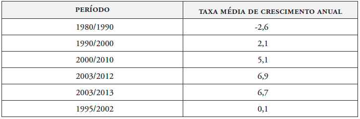 Nas últimas três décadas o ritmo de crescimento da economia brasileira foi bastante diferenciado, influenciando o ritmo de desconcentração produtiva regional no país, conforme descreveu Cano (2008). O pib cresceu a uma taxa de 1,6% a.a. entre 1980 e 1990; 2,5% a.a. entre 1990 e 2000 e 3,6% a.a. entre 2000 e 2010. Entre 2003 e 2012, quando determinantes da política interna e o ritmo das exportações de commodities geraram efeitos dinâmicos sobre as economias regionais, especialmente Nordeste, Centro-Oeste e Norte do país, o pib brasileiro cresceu em média 3,9% a.a. Como resultado, o pib per capita variou nos mesmos períodos em média -0,4% a.a. (1980-1990), 0,9% a.a. (1990-2000), 2,4% (2000-2010) e 2,8% a.a. (2003-2012). Em 2000, o pib per capita, em termos reais, era apenas 4,8% maior do que em 1980, o que confirma o mal desempenho da economia do país nas duas últimas décadas do século xx.