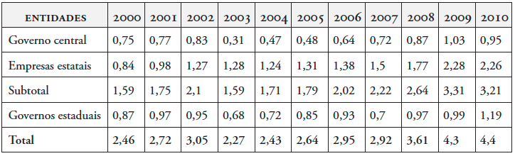 Na quadro 4, observa-se o crescimento relativo dos investimentos públicos, que “deram contribuição decisiva à execução da estratégia governamental de operar uma trajetória estável e ascendente do produto e do emprego. Não é por outra razão que as taxas de crescimento econômico aumentaram relativamente ao padrão da década anterior” (Monteiro Neto, 2014, p. 38). Importante destacar, conforme veremos adiante para Programa de Aceleração do Crescimento (pac), que o investimento público - diferente do privado - pode direcionar-se por outros critérios que não os de mercado, cumprindo importante papel para a dinâmica das regiões menos desenvolvidas.