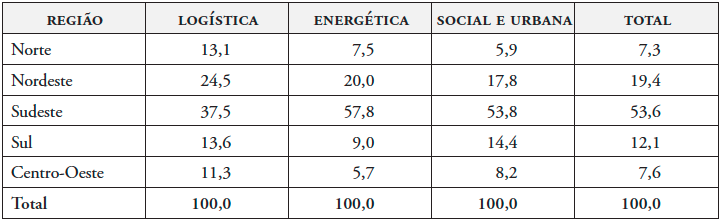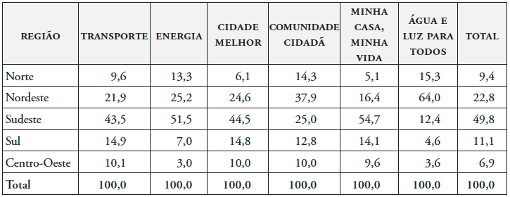 Em relação aos investimentos públicos, observa-se pelos quadros 5 e 6 que as obras do pac9 apresentam caráter desconcentrador, na medida em que as participações das regiões Norte e Nordeste na carteira de investimentos superam suas participações no pib brasileiro. Nas regiões com piores indicadores sociais e infraestruturais, esse direcionamento representa uma ação positiva no sentido de diminuir as desigualdades regionais. No entanto, do ponto de vista socioambiental, os efeitos negativos de muitos desses investimentos, principalmente em infraestrutura energética na Região Norte, são objeto de denúncias em meios acadêmicos, jornalísticos e por parte do Ministério Público10. Isso indica uma possível piora na qualidade de vida das populações que vivem em áreas próximas a esses investimentos11.