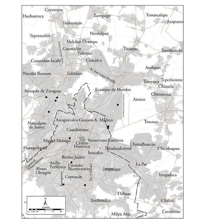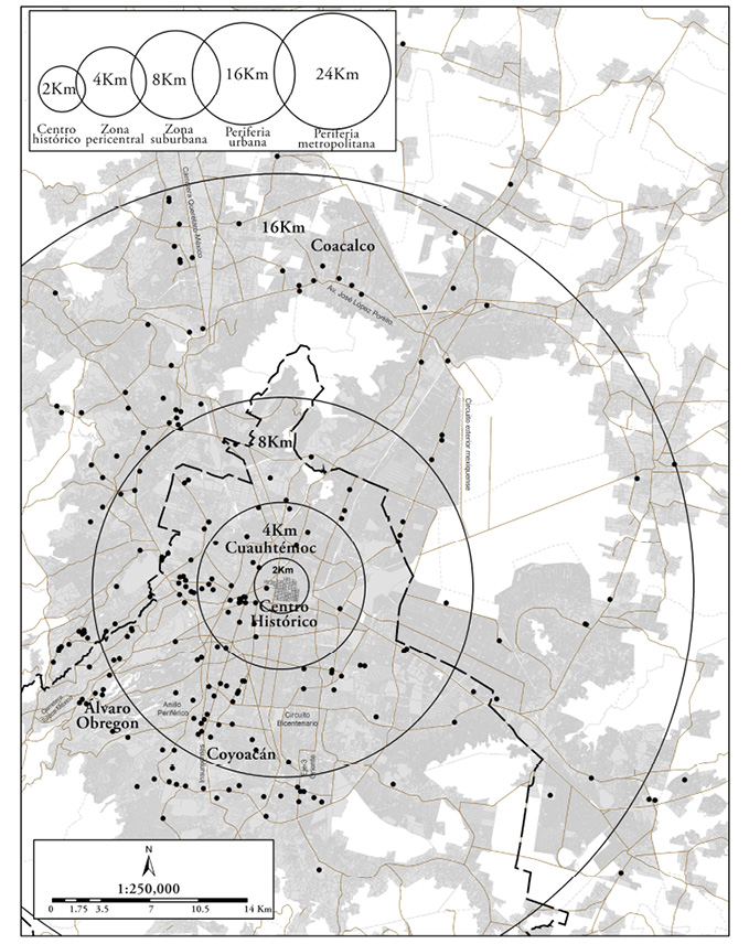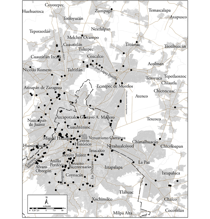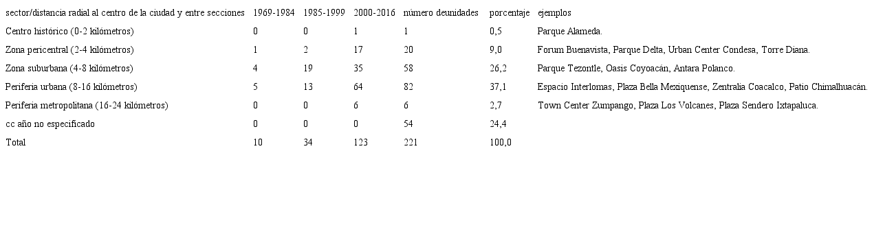 Segundo, una producción importante de equipamientos en áreas pericentrales y suburbanas sujetas a procesos de reciclamiento urbano sobre enormes predios, como los registrados en los casos de Moliere Dos22 (2003), que se levantó donde se ubicaba un colegio de jesuitas; Parque Delta (2005), que ocupó el predio del antiguo parque de béisbol perteneciente al organismo federal de seguridad social (Instituto Mexicano del Seguro Social); Fórum Buenavista (2008), el cual se desarrolló sobre la desaparecida estación central de ferrocarriles de pasajeros de la ciudad; Plaza Ciudad Jardín, en una zona clausurada de confinamiento de residuos sólidos; Paseo Acoxpa (2010) lo hizo sobre los terrenos que dejó una antigua fábrica de hilados sintéticos; más recientemente, Centro Comercial Las Américas (2012) se edificó sobre los terrenos que ocupaba una empresa de productos químicos (Sosa Texcoco); Plaza Carso (2014) se instaló en la antigua zona industrial de la Ampliación Granada; Oasis Coyoacán (2015) se edificó sobre un predio anteriormente ocupado por una fábrica estadounidense de cosméticos; Parques Toreo Central (2015) se instaló en el antiguo centro de tauromaquia y espectáculos del Toreo de Cuatro Caminos; Pabellón Cuemanco (2015) se edificó sobre un extenso predio que dejó una empresa dedicada a la venta de muebles y electrodomésticos; finalmente, Parque Vía Vallejo (2016) ocupó el área que dejó el cierre de una fábrica de cartón.