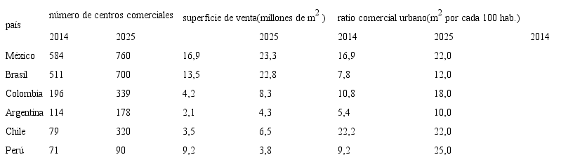 Los cc mexicanos tienen actualmente una presencia sobresaliente en el contexto latinoamericano tanto en número como en superficie de venta. De acuerdo con el International Council of Shopping Centers (icsc, 2015), en el año 2014 México ocupó el primer lugar en América Latina, con 584 unidades; le siguen Brasil con 511, Colombia con 196 y Argentina con 114 (tabla 1). México también cuenta con más superficie rentable al sumar 16,2 millones de metros cuadrados; y después de Chile, tiene el ratio comercial urbano más alto en este segmento, equivalente a 16,9 metros cuadrados por cada 100 habitantes (icsc, 2015). El crecimiento diferenciado de cc en algunos países representativos de América Latina sugiere una relación directa respecto a la población urbana absoluta y relativa de cada país. Sin embargo, el hecho de que México supere a Brasil en número de cc, y Chile a México en términos de ratio comercial, evidencia que se trata de un fenómeno más complejo. Existen indicios para pensar que la difusión del modelo de cc en esta escala estaría relacionada principalmente a la estructura del sistema urbano y la presencia de segmentos sociorresidenciales medios y altos en las ciudades.