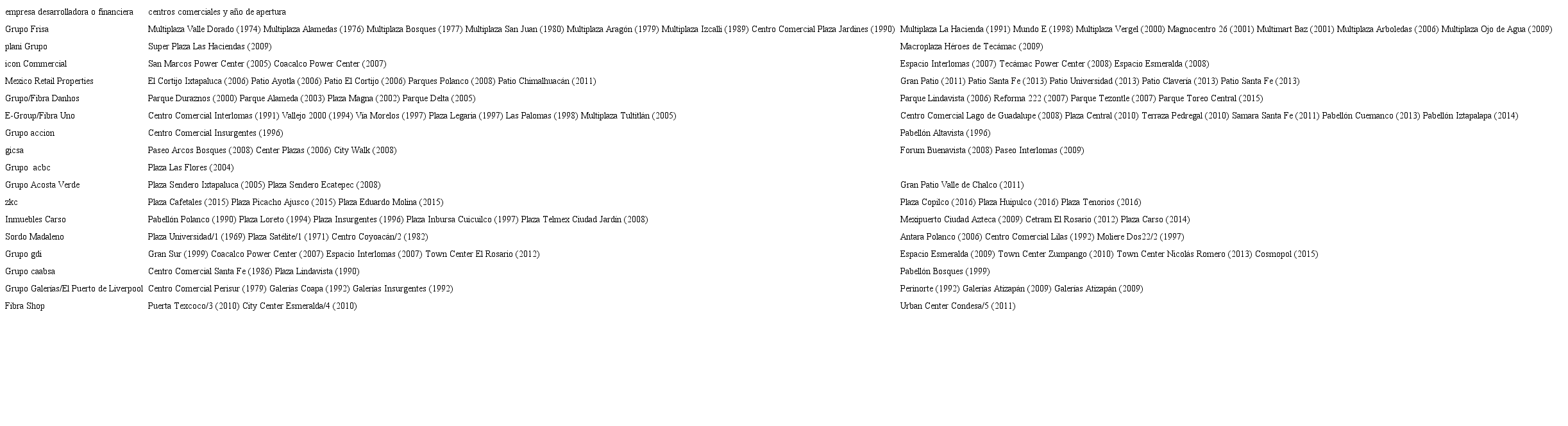 Las grandes empresas inversionistas internacionales y nacionales generalmente están asociadas a grupos de desarrolladores mexicanos y extranjeros, aunque algunos de estos también participan como arrendatarios, al ser poseedores de acciones compartidas con empresas inversionistas y comerciales, o bien participando en sus propias divisiones de empresas financieras. Por ello, es posible encontrar distintas modalidades de desarrolladores dentro del ámbito de construcción y operación de cc. En México, y particularmente en la zmvm, la participación de desarrolladores y operadores en el mercado inmobiliario es diversificada, considerando la cantidad y tamaño de los proyectos donde vienen participando (tabla 2).