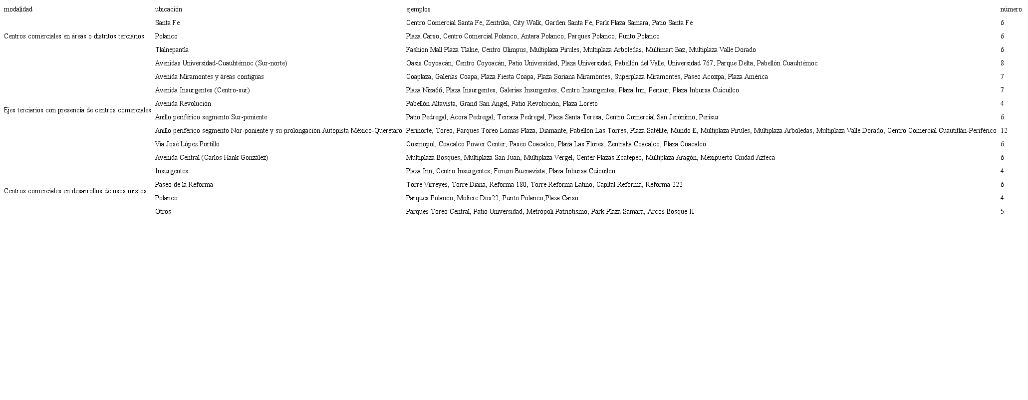 En tercer lugar, la localización de la mayoría de cc sigue la lógica de agruparse sobre importantes áreas residenciales medias, con una mayor presencia en la parte poniente y sur de la metrópoli y sobre ejes urbanos comerciales y áreas terciarias. Así, podemos destacar su presencia en avenida Cuauhtémoc y su prolongación avenida Universidad; sobre Insurgentes en su segmento centro y sur; a lo largo de avenida Miramontes en la zona de Villa Coapa y en el segmento poniente del periférico. En el caso de áreas con una importante actividad terciaria, destacan Polanco, la zona de Santa Fe y Cuicuilco, lugares donde los cc han tendido a integrarse en áreas financieras y complejos corporativos y de oficinas; mientras en el norte destaca la zona de Satélite en Naucalpan y el corredor de Periférico Norte y su prolongación Autopista México-Querétaro (Tlalnepantla y Cuautitlán), así como la vía José López-Portillo en su segmento Coacalco y Tultitlán (tabla 4).
