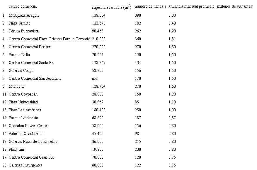 El mercado de megaproyectos destinados al consumo y comercio ha encontrado en México un campo fecundo para la captación de rentas urbanas. Cushman y Wakefield (2015), empresa encargada de monitorear precios de renta en áreas comerciales a nivel internacional, reportó que los tres cc en la Ciudad de México con mayores rentas por metro cuadrado mensuales son Antara Fashion Hall y Centro Comercial Perisur, con 80 dólares cada uno, seguidos por Centro Comercial Santa Fe, con 75 dólares, valores solo superados por la calle comercial de lujo Presidente Masaryk en la zona de Polanco y la calle peatonal Madero, ubicada en el centro histórico, que cotizaban cada una alrededor de 90 dólares por metro cuadrado.6