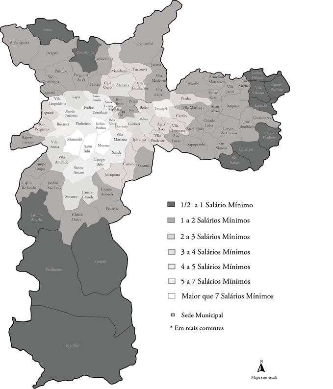 Embora a população pobre se faça presente por toda parte, habitando zonas deterioradas, cortiços e enclaves de áreas valorizadas, o lugar onde se concentra e que constitui a expressão mais clara do seu modo de vida é a chamada “periferia” (Durham, 2004). A periferização da pobreza retrata, com efeito, a conformação de espaços de pobreza onde seguem se acumulando uma série de desvantagens (Aguilar & López Guerrero, 2016). Em metrópoles como São Paulo, as periferias caracterizam-se, tradicionalmente, como localizações marcadas pela pobreza e pela precariedade, uma vez que agregam áreas desvalorizadas onde reside mormente uma população de baixa renda (figura 2) e predominam infraestruturas precárias e equipamentos de serviços deficientes (Bonduki & Rolnik, 1979).