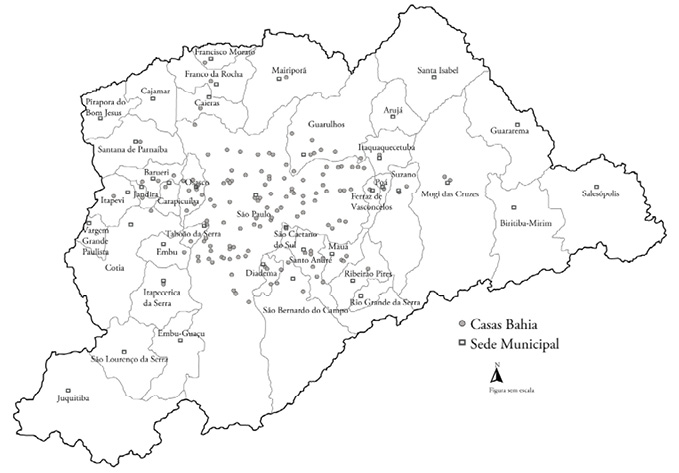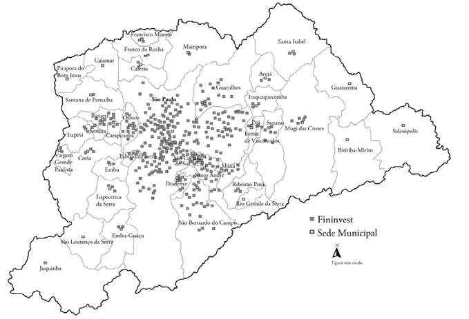 Dentre as agências financeiras de crédito ilustradas, Finasa e Crefisa se destacam como aquelas com o maior número de lojas em São Paulo, fazendo-se presentes não só em seu centro expandido, mas nas periferias das zonas leste e sul, nas proximidades de Santo André, São Bernardo do Campo, São Caetano (a “região do ABC”) e em municípios como Taboão da Serra, Osasco, Itapecerica da Serra e Carapicuíba. A Crefisa possui atualmente 63 lojas apenas no Município de São Paulo e mais 36 nos demais municípios da Região Metropolitana. Já a rede Finasa possui 47 lojas no Município de São Paulo, as quais se acrescentam mais 36 nos demais municípios da Região Metropolitana. No espaço intra-urbano, a topologia das financeiras e dos bancos especializados em atender as camadas de baixa renda se materializa não só por meio de lojas próprias, mas através de pontos de venda, quiosques em supermercados, hipermercados, estações do metrô e shopping centers populares.