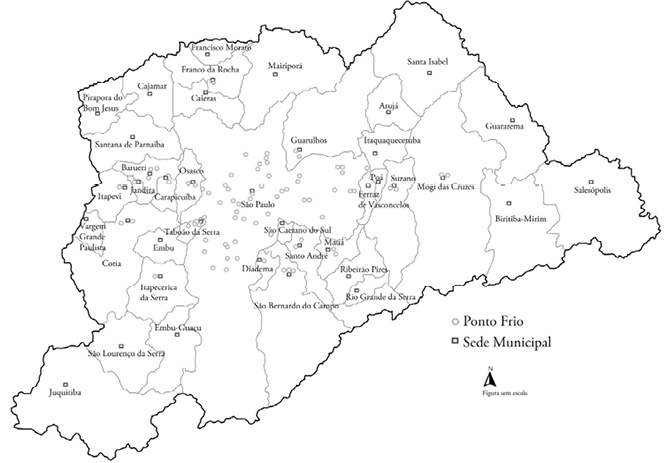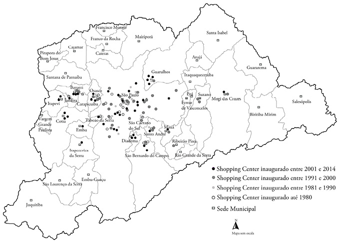 A difusão dos shopping-centers em São Paulo nos últimos anos também integra as recentes transformações territoriais em sua periferia. A metrópole de São Paulo contabiliza atualmente 55 shopping-centers espalhados por seu tecido urbano (Associação Brasileira de Shopping Centers [abrasce], 2015). Embora estejam concentrados nas áreas centrais, os shoppings e lojas de grandes empresas se espraiaram recentemente para bairros mais periféricos da cidade, como Campo Limpo, Jardim São Luiz e Socorro na zona sul, e Itaquera e São Miguel na zona leste, assim como para cidades que margeiam o Município de São Paulo e reúnem grandes periferias pobres, como Taboão da Serra e Itapecerica da Serra, logrando, assim, um alcance de maior escala junto à população de baixa renda (figura 7).