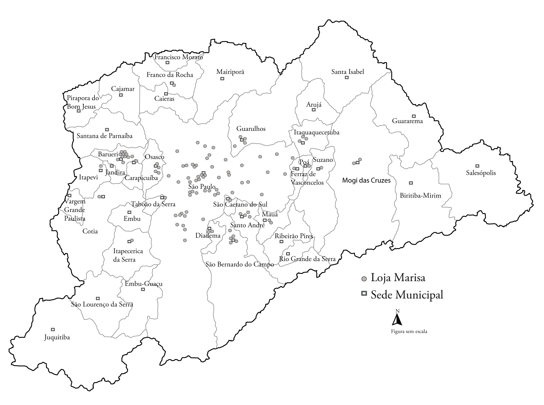 A difusão das grandes redes varejistas no tecido urbano da metrópole paulistana se dá no mesmo sentido e intensidade. Muitas vezes alojadas dentro de shoppings, as redes de varejo de móveis, eletrodomésticos e vestuário, como Casas Bahia, Ponto Frio e Lojas Marisa, respectivamente, se destacam entre os agentes do circuito superior que têm alcançado maior capilaridade no território nos últimos anos. Apenas a rede Casas Bahia possui atualmente 142 lojas espalhadas pela Região Metropolitana de São Paulo, das quais 84 se encontram no Município de São Paulo (figura 8). A rede Ponto Frio possui, por sua vez, 49 lojas no Município de São Paulo, contabilizando 79 pontos de venda na Região Metropolitana (figura 9). Já a rede popular de confecções Marisa possui 103 estabelecimentos na Região Metropolitana como um todo, das quais 54 localizadas no Município de São Paulo (figura 10).