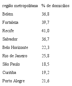 A redução da pobreza ao longo da última década envolveu diferentes processos de ordem social e territorial. A pobreza apresenta-se hoje menos concentrada nas áreas rurais, já que em 1992, os estratos rural, urbano e metropolitano concentravam 24,3%, 44,5% e 31,2% da pobreza brasileira, enquanto em 2009, estes percentuais alcançavam respectivamente 15,3%, 48,4% e 36,4% (Rocha, 2009). A atual intensidade da pobreza nas metrópoles brasileiras, onde o custo de vida é mais elevado e a produção de necessidades mais exacerbada, encontra-se ilustrada na tabela 1, a seguir. Vale destacar que a proporção de domicílios com rendimento médio mensal até 2 salários mínimos, ou seja, de até ½ salário mínimo per capita, corresponde à definição oficial mais correntemente adotada no Brasil enquanto linha de pobreza (Rocha, 2006;ibge/pnad, 2009).