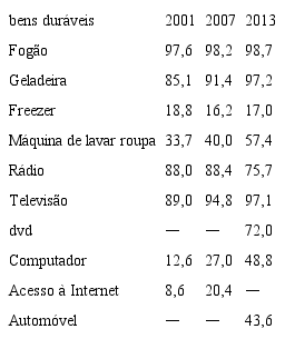 Ao longo dos anos 2000, houve efetivamente uma forte expansão da presença de bens de consumo duráveis nos domicílios do país. Eletrodomésticos como fogão, geladeira e televisão praticamente se universalizaram nas residências brasileiras: em 2013, 97,2% dos lares possuíam geladeiras, 98,7% fogão e 97,1 % televisão (ibge/pnad, 2013). A evolução da presença de certos bens duráveis nos domicílios brasileiros entre 2001 e 2013 pode ser entrevista na tabela 2.