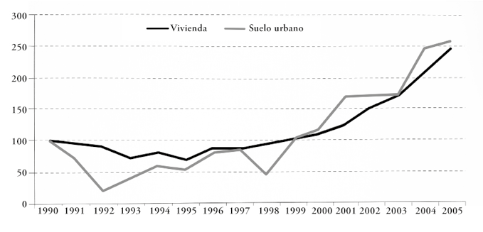 De lo antedicho se deriva que el crecimiento de estos valores sea bidireccional, generando “una espiral inflacionista en el precio del suelo. El aumento de la demanda de vivienda se plasma en un aumento de su precio que se transmite, a partir de las expectativas que genera, en saltos importantes en los precios del suelo. El aumento del precio del suelo provoca un aumento de los costes que los promotores y los constructores trasladan al precio de la vivienda que, de esta forma, aumenta todavía más y presiona al alza el precio del suelo, y así sucesivamente” (García, 2000, p. 34; véase también Berges & Ontiveros, 2007, pp. 266 y 268).