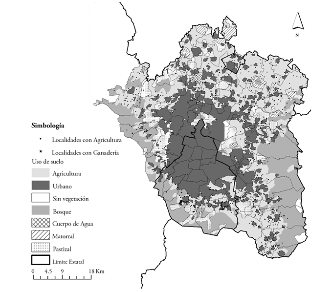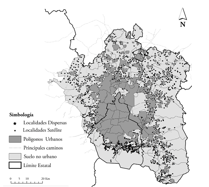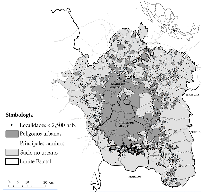 Si bien el territorio de la zmvm es heterogéneo, la concentración histórica de la ciudad impacta y define la conformación del suelo no urbano que la rodea, el cual facilita o inhibe la consolidación o formación de pequeñas localidades, cuyas particularidades socioterritoriales son variadas y definidas por el entorno mismo. Por lo tanto, se cree que hay una relación bidireccional entre las pequeñas localidades asentadas en el suelo no urbano de la región, y los polígonos urbanos contiguos. Tal relación se da en tres aspectos: primero, las localidades pequeñas albergan población nueva o expulsada de la ciudad; segundo, provechan el equipamiento, los servicios y el transporte público de los polígonos urbanos más próximos; y tercero, constituyen reserva de mano de obra, recursos naturales y agropecuarios que se producen generalmente en los espacios no urbanos (Fernández, 2011) y que surten al mercado de la ciudad.